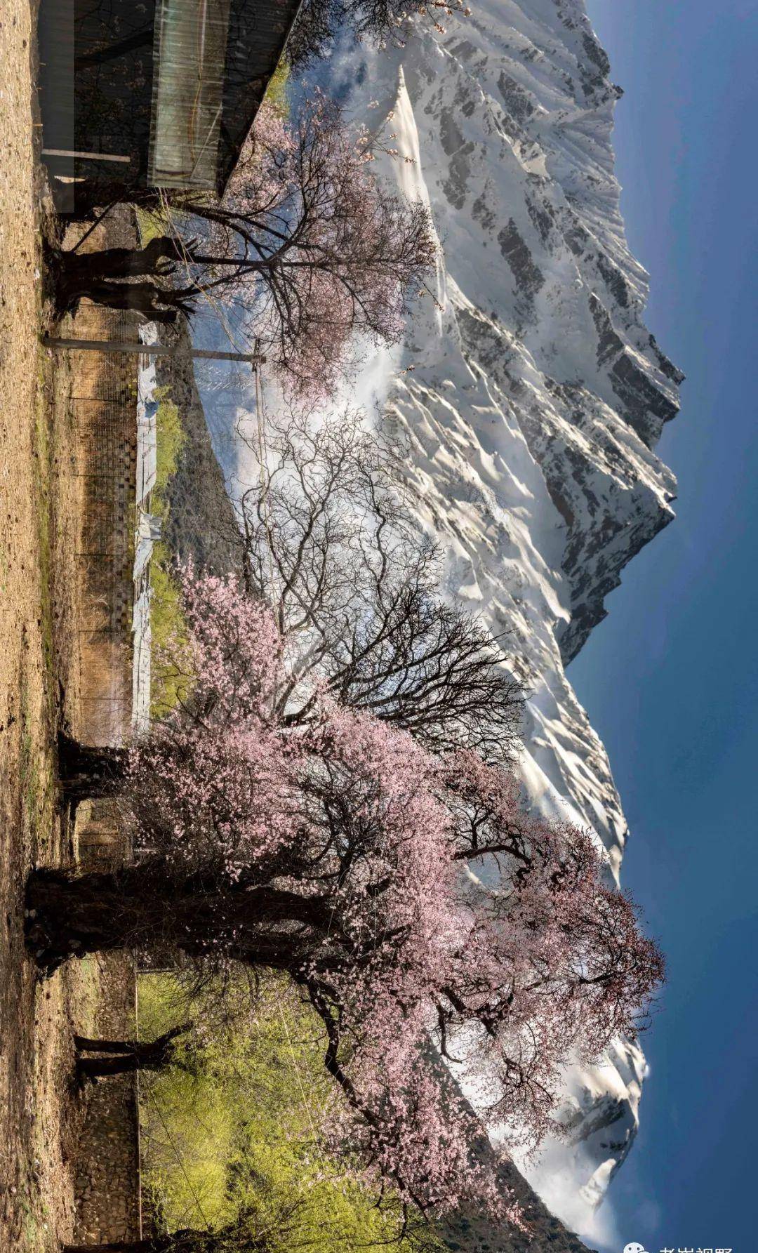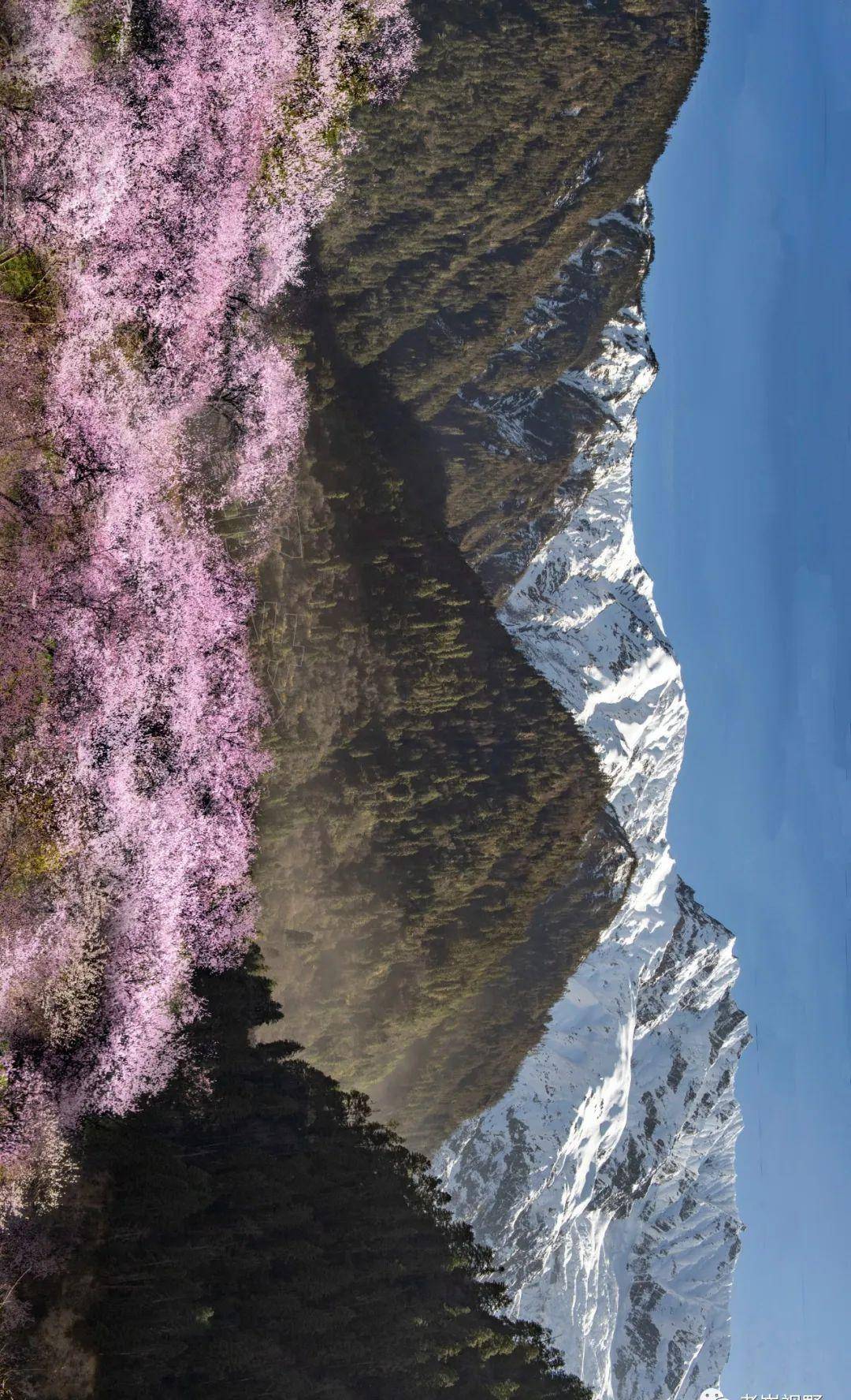 (请横屏。雪山下肆意绽放的野桃花。摄影@邯郸老崔)