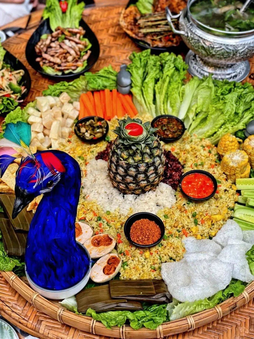 孔雀宴是傣家最具特色的宴席之一,采集原生态新鲜食材,傣家传统烹饪方法烹饪而成,摆放成孔雀开屏的形状。