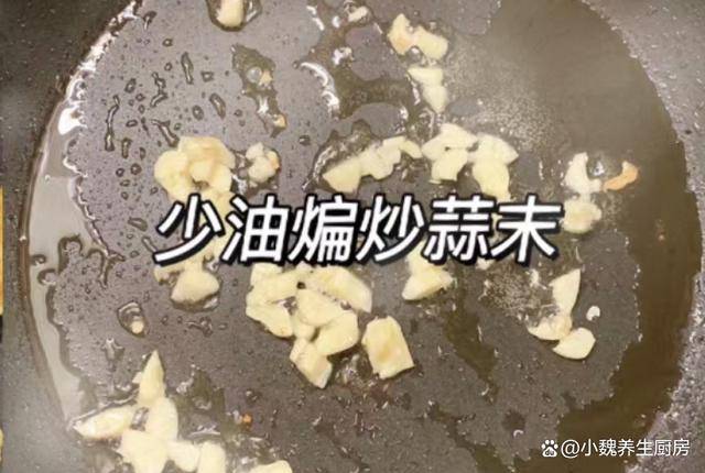 第五步:锅中加上一些食用油,加上一些蒜末炒香,倒入一些芦笋炒至断生,倒入白玉菇和蟹味菇,迅速翻炒一会儿。