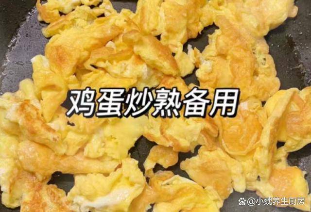 第四步:锅中提前烧热,加上食用油若干,倒入调好的鸡蛋液,让鸡蛋液微微凝固,迅速翻炒成小块,将其盛出备用。