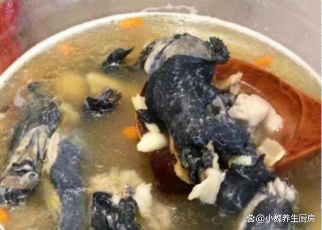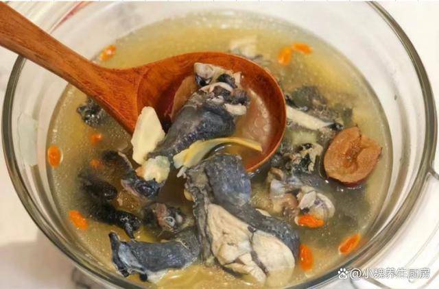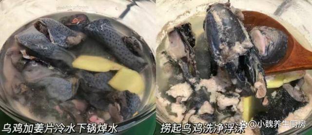 6:盖上锅盖大火煲汤,中途要撇去一层浮沫,小火煲1.5个小时,等待乌鸡汤熬制色泽偏黄,能够闻到香味,乌鸡肉煮至软烂。