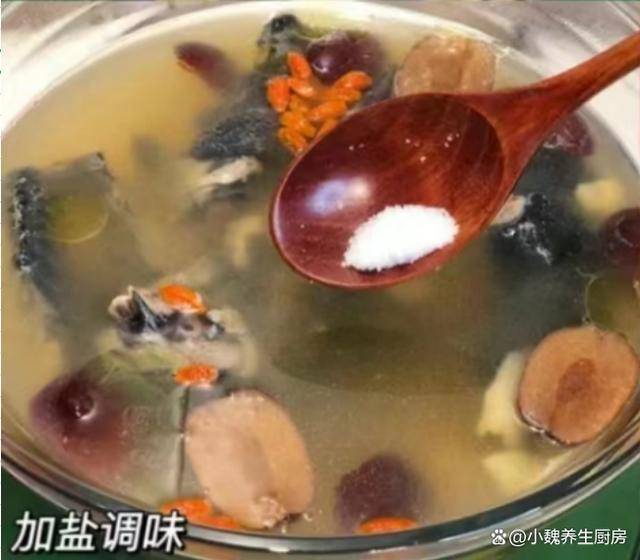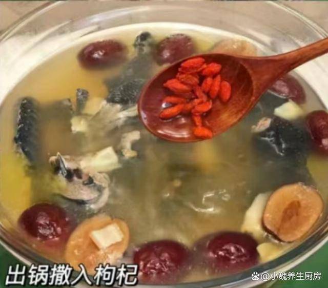 7:丢入一些枸杞子,继续焖煮一小会儿,加上食盐和其他佐料,继续煮2分钟,出锅,这款西洋参百合红枣乌鸡汤就烹饪完成了。