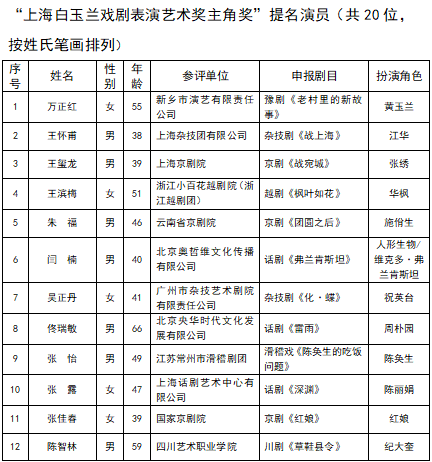第31届上海白玉兰戏剧表演艺术奖今日公布各奖项提名名单,主角奖提名演员20名,配角奖提名演员10名,新人主角奖提名演员5名,新人配角奖提名演员5名。本届白玉兰戏剧奖特殊贡献奖授予著名表演艺术家陈奇,奖掖其为中国戏剧艺术事业作出的突出贡献。4月21日晚,第31届上海白玉兰戏剧表演艺术奖颁奖晚会将在上海文化广场举行,揭晓各奖项名单。