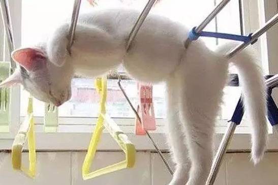 2、家里晾衣服的地方都可以成为猫咪睡觉的地方,即使那里有一定的难度,为了睡觉,猫咪还是可以爬上去,四肢挂在晾衣架上,变成了晾猫。
