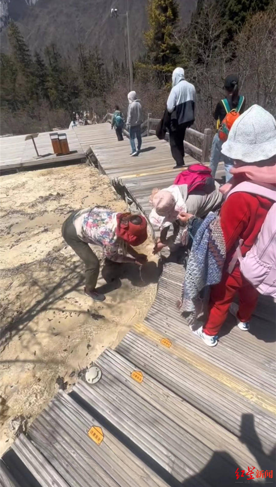 4月16日,有网友爆料四川阿坝黄龙景区内有人脚踩钙华池洗手,经游客提醒后,大妈才起身回到栈道。对此,黄龙景区回应,钙华滩池景观一旦破坏很难恢复,景区内张贴有文明旅游标语,还滚动播放温馨提示,后续会通过票据信息联系当事游客批评教育。