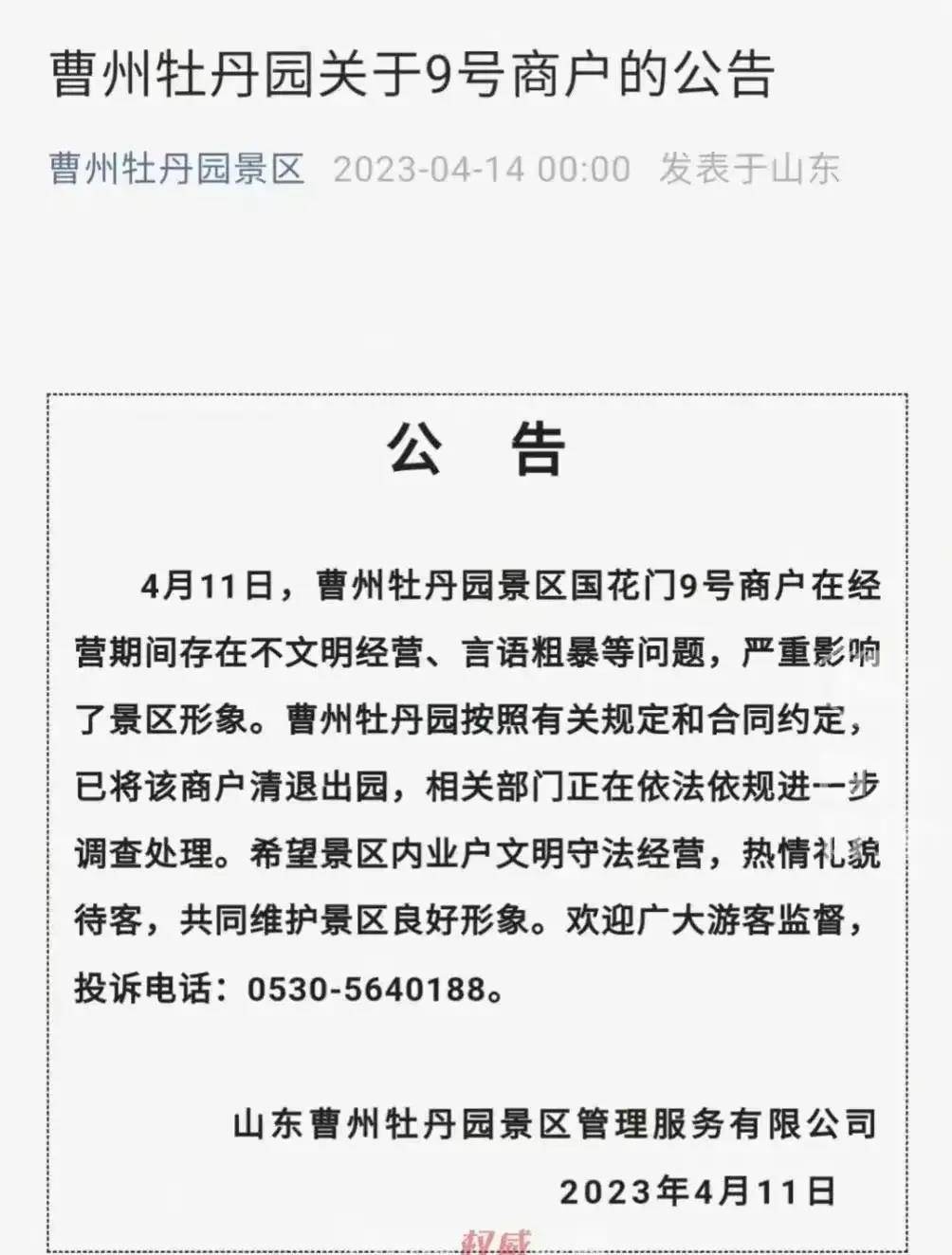 之后,曹州牡丹园景区做出对店铺关门停业处理。
