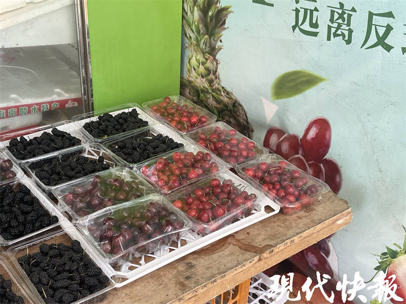 在秦淮区的一家超市内,樱桃被放置在了水果售卖区域的“C位”上。相较于大家熟知的车厘子,樱桃的个头更小,而且颜色更红。这里售卖的樱桃卖相非常好,不仅果实大,颜色更是红如玛瑙,不过对应的价格并不太“美丽”。现代快报记者了解到,这里售卖的樱桃品种为美早,产地为辽宁大连,一盒250g的售价要45.9元。在宣传页上,店家承诺单果重量达到10g以上。