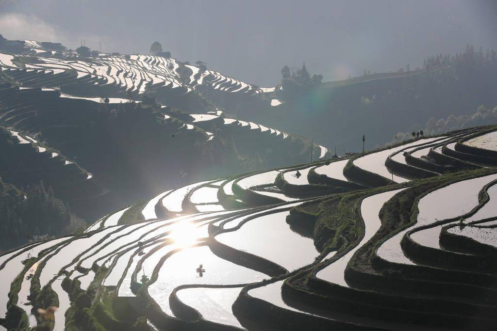 在阳光的照耀下,一层一层的梯田就变成了一面面天空之境,明亮而清澈。图/视觉中国