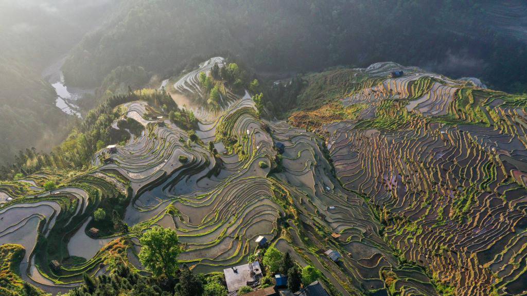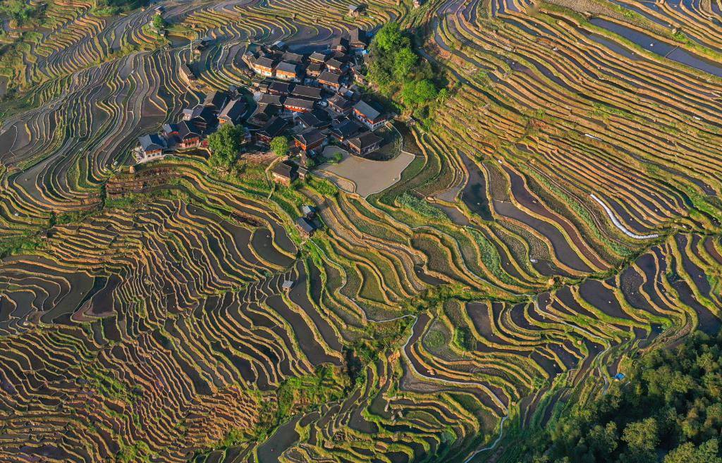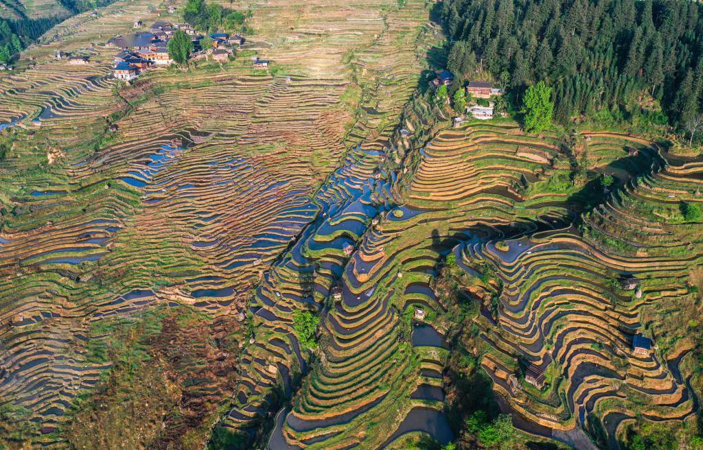 谷雨前后,位于贵州黔东南大山深处的加榜梯田蓄水丰盈、线条分明。图/视觉中国