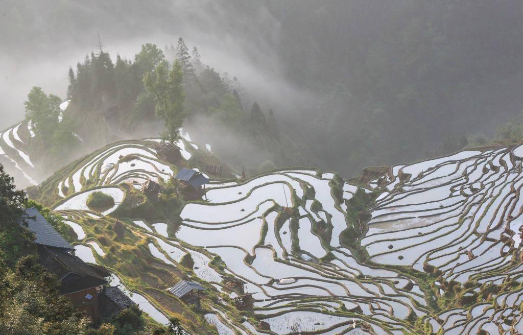在晨曦里,加榜梯田犹如条条银丝带在山野闪烁,恍如天上人间。图/视觉中国