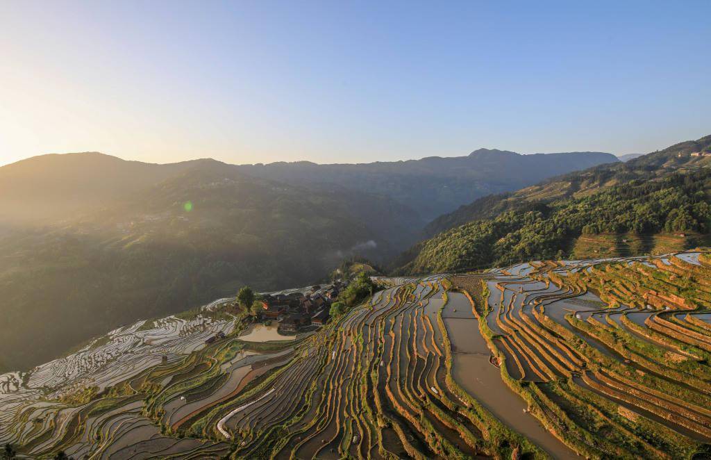 青山环抱着梯田,苗寨点缀其间,在不同的光线下呈现出不同色彩,如诗如画。图/视觉中国