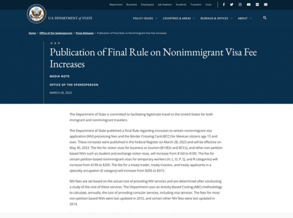 商务或旅游访问签证(B1/B2s和BCCs),以及其它非申请类非移民签证,如学生和交流访问者签证的费用,将从160美元增加到185美元;