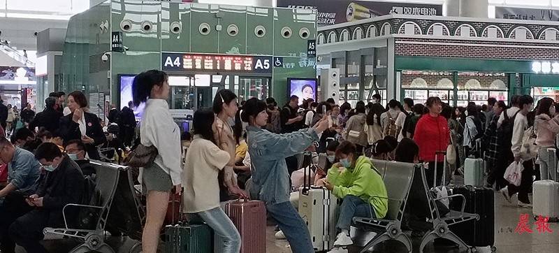 ▲在火车站候车大厅,不时可见组团出游的大学生。