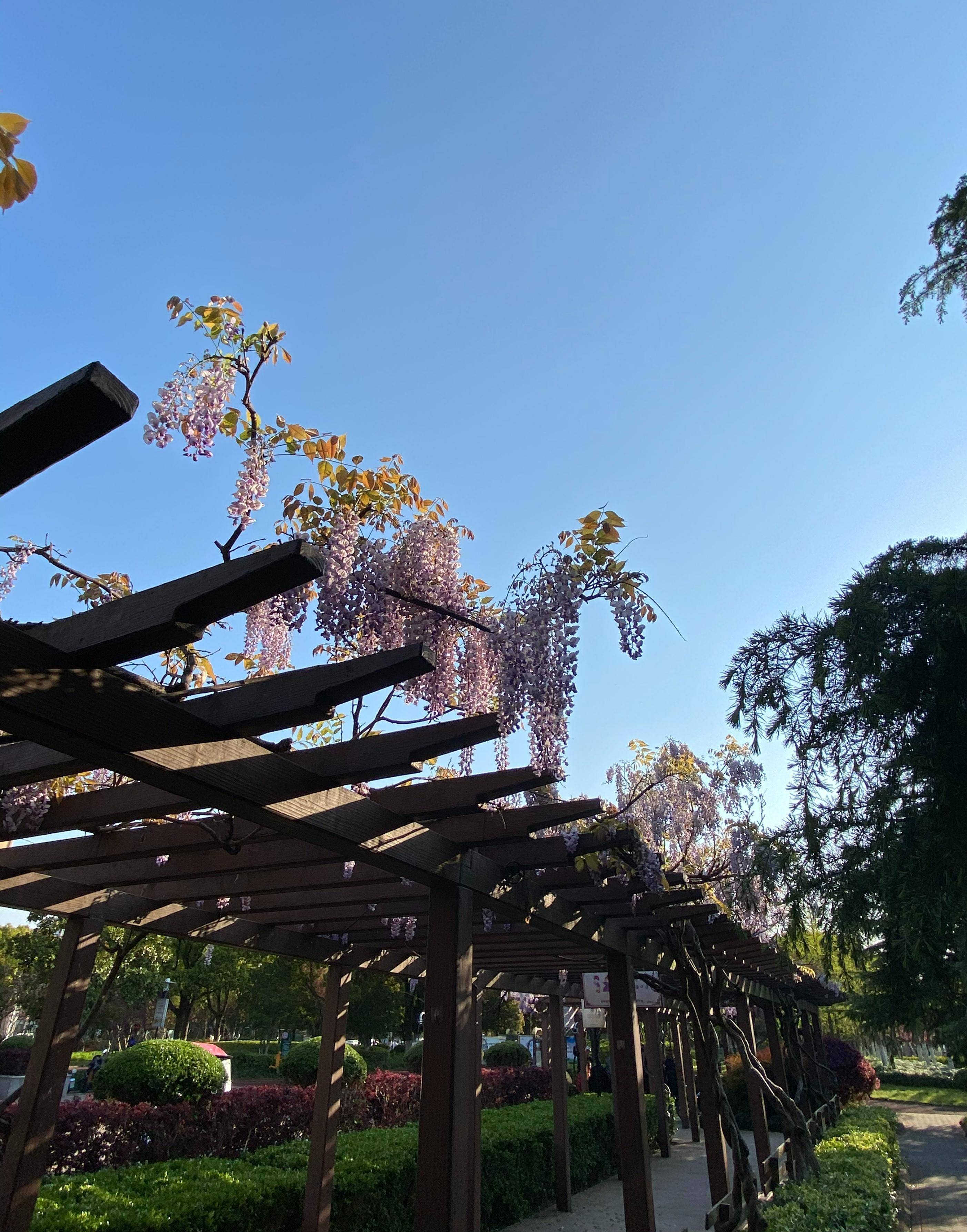瞿门路广场是外冈的生活广场,紫藤花盛开在4月,错过花期,需要再等上一年。