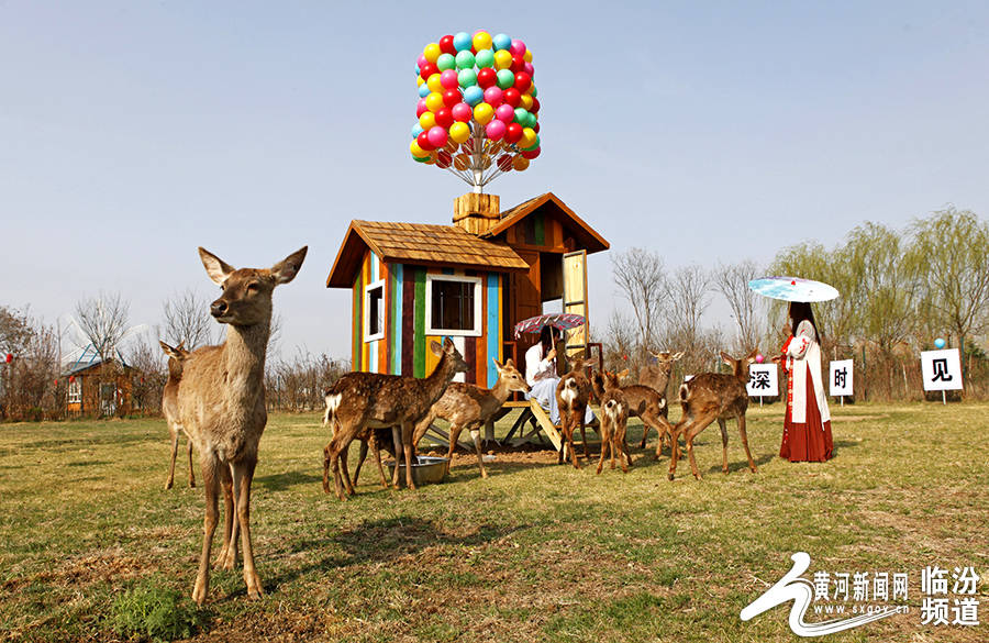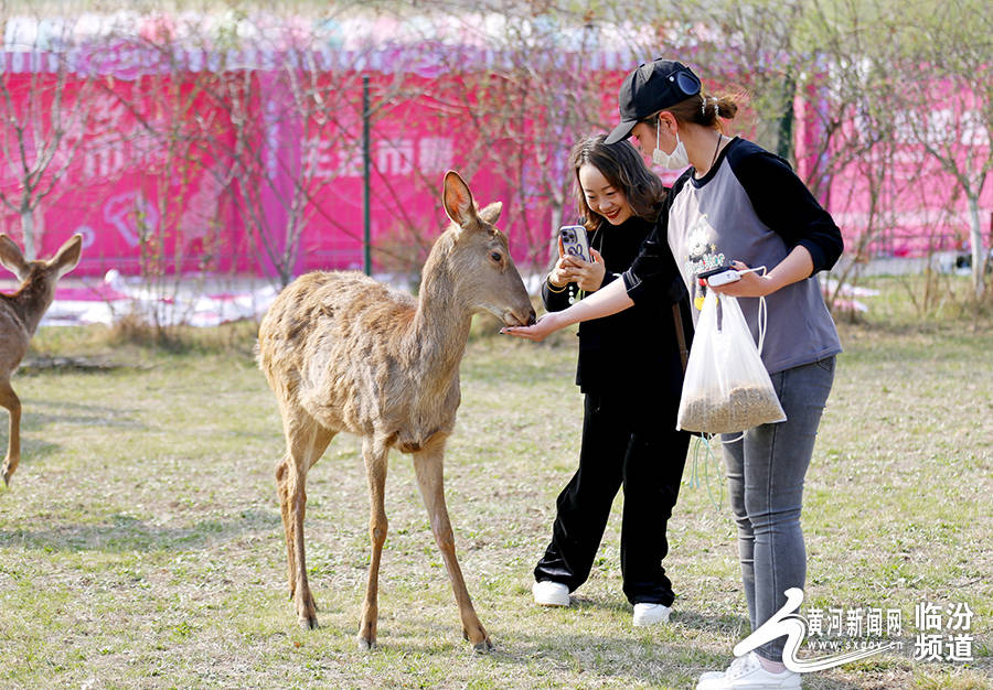 3月27日,在山西省襄汾县林乡四季庄园内,游客在鹿岛公园内体验喂鹿。