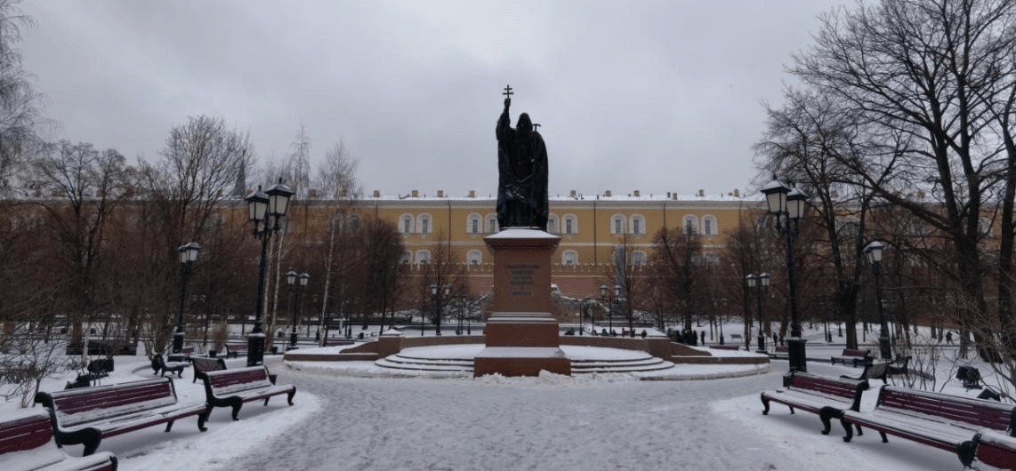 莫斯科亚历山大花园广场上的一尊雕像,其后是克里姆林宫建筑(记者王新俊 摄)
