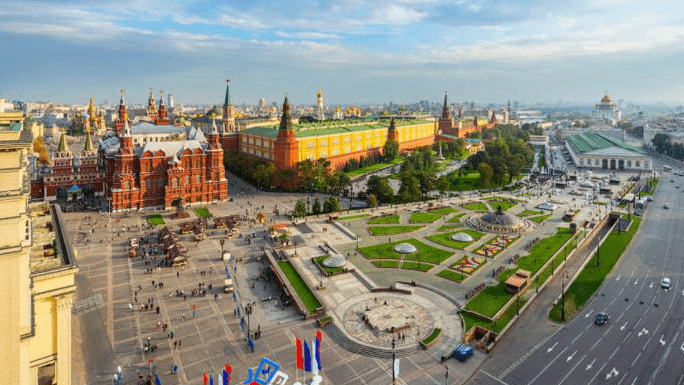 从俄罗斯国家杜马楼顶方向看到的莫斯科亚历山大花园及马涅什广场。(图自当地网络)