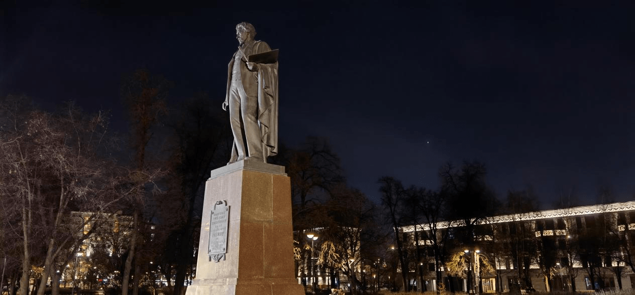 莫斯科列宾广场夜景,雕像为俄罗斯著名画家列宾(记者王新俊 摄)