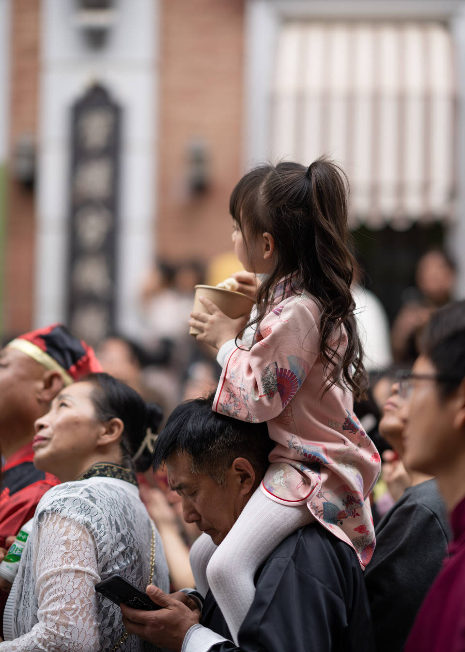 小朋友也穿上旗袍,坐在家人的肩头上观看演出。