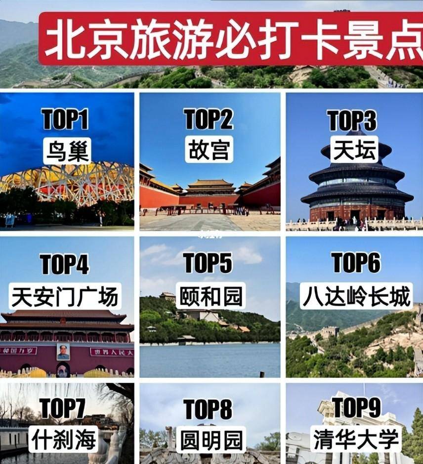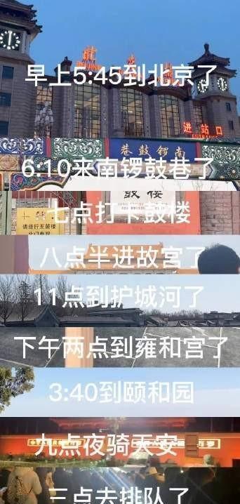 “天安门升旗看了,景山公园登高望远了,故宫角楼拍了,东交民巷到了,大栅栏前门瞧了,天坛祈年殿去了,门钉肉饼吃了,什刹海游了,鼓楼经过了,烟袋斜街五道营去了。”