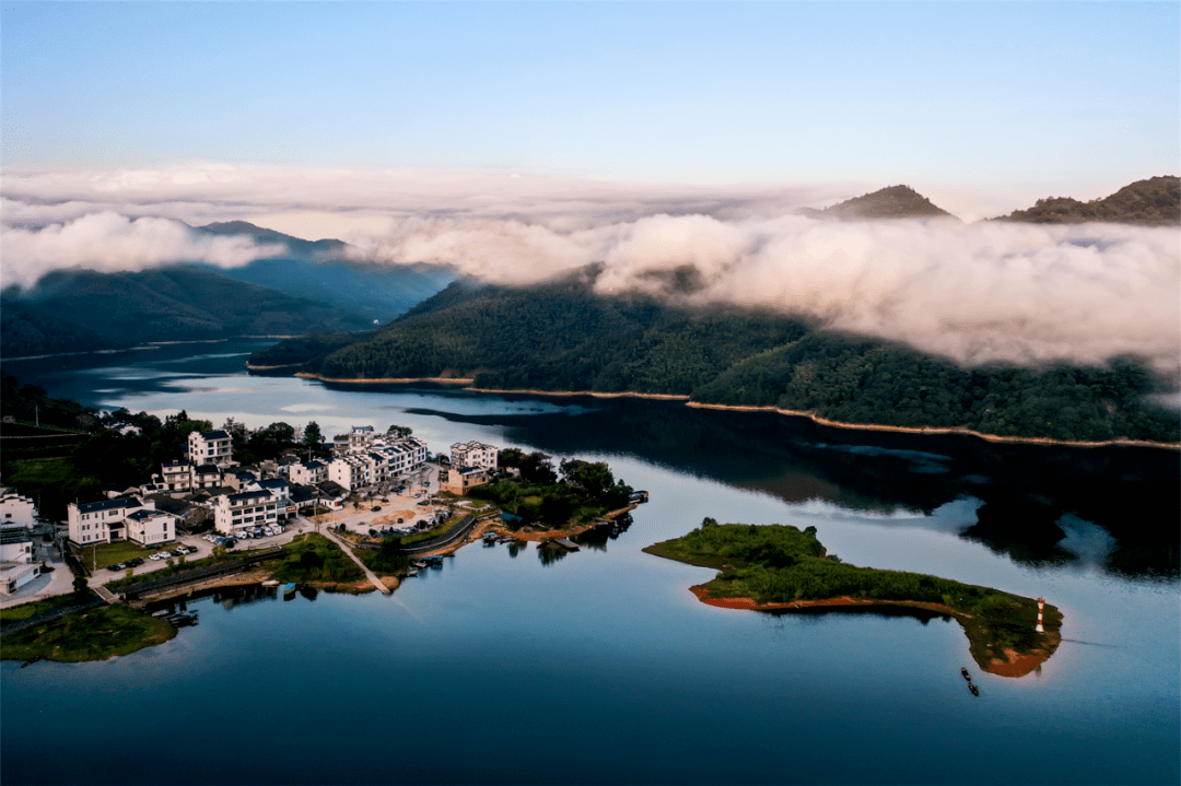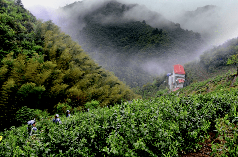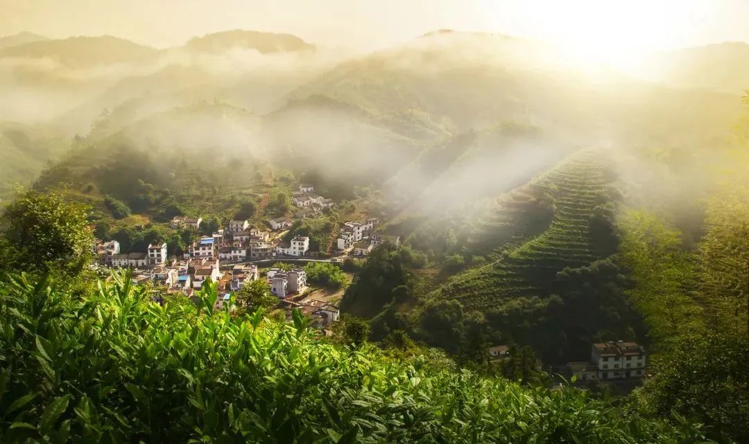 茫茫的雾霭笼罩着茶园。沿梯田而上,一垄又一垄的茶树仿佛看不到尽头。碧绿的湖水,葱绿的树木、小小的村落。在这湖光山色之间,一幅秀美的中国山水画在眼前缓缓展开。