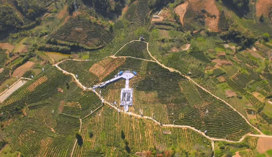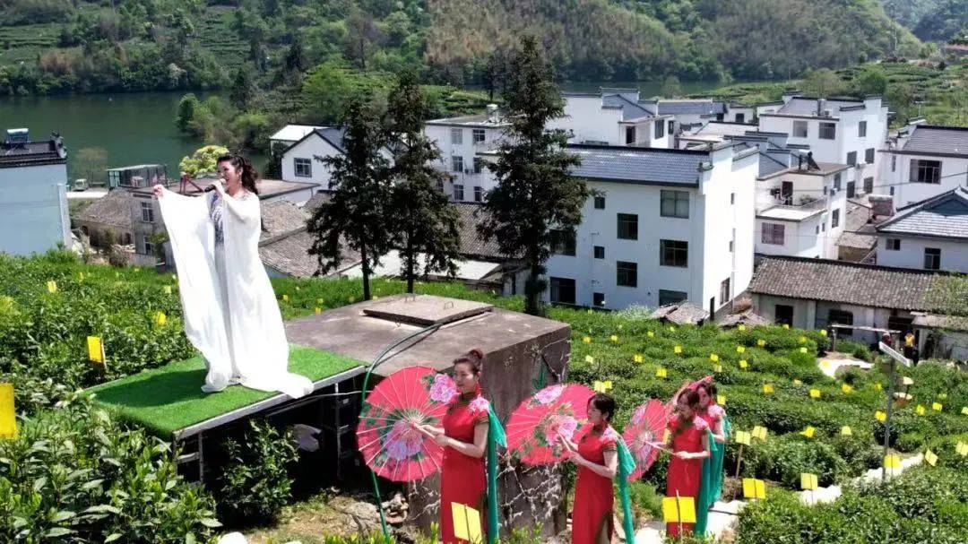白墙黑瓦的村落掩映在茶山碧水之中。春日美景下,歌手站在高台上引吭高歌。好景,好茶,好表演,还不能成为你来此一游的理由吗?