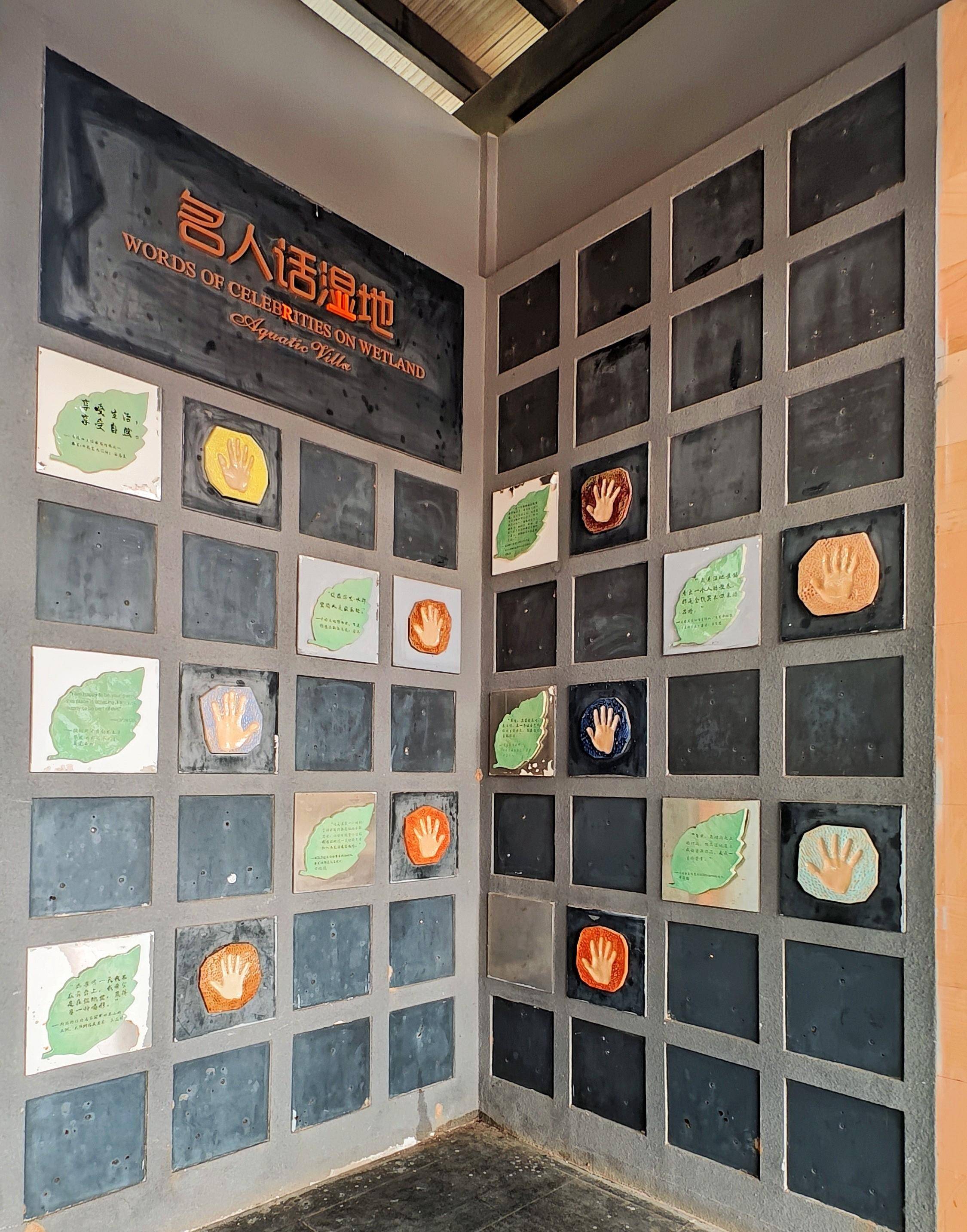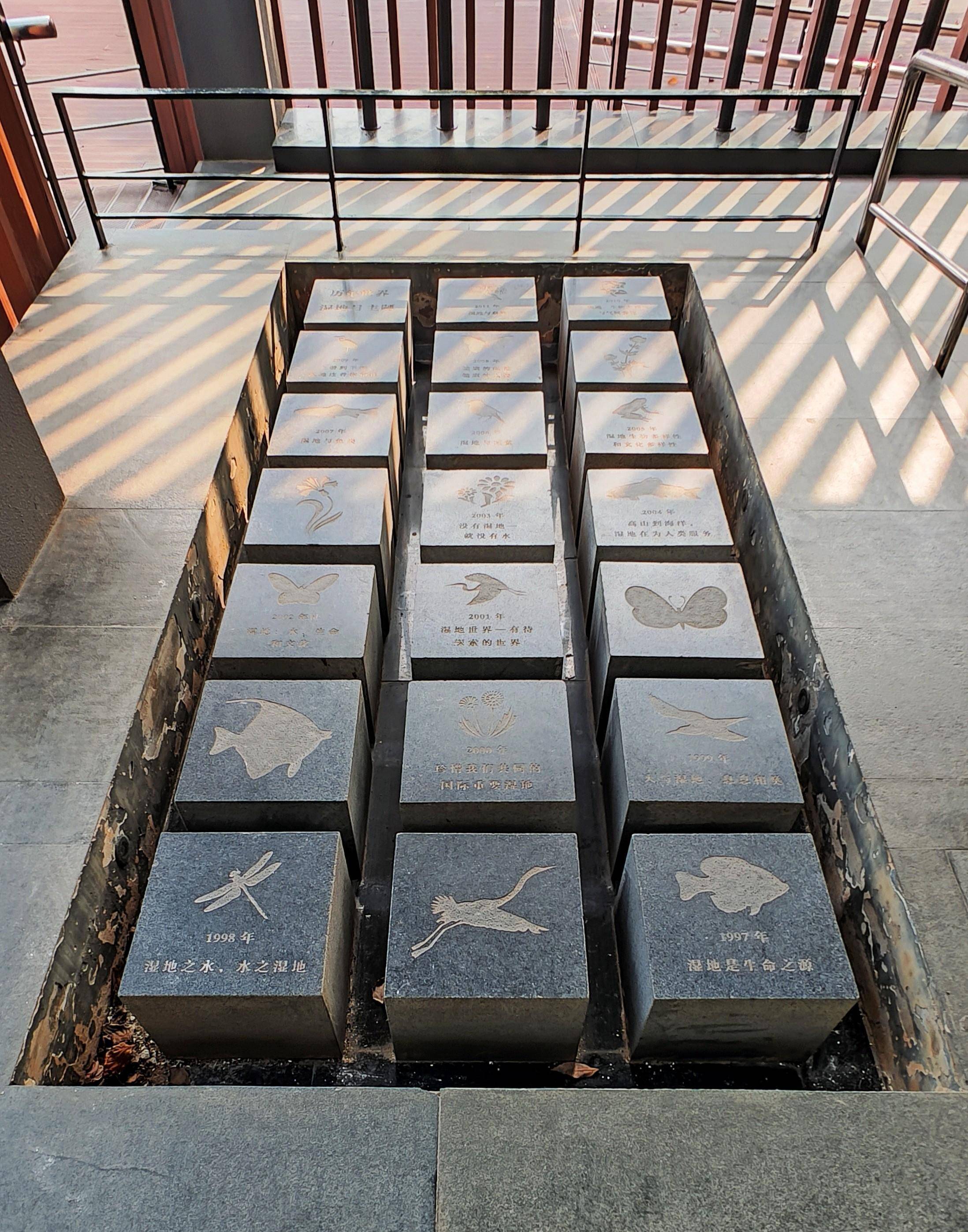 公园入口就是湿地资料馆,我们可以看到湿地保护的相关资料,如地上排列石块上雕刻的历年世界湿地纪念日的主题,墙上的名人话湿地,木栅上的各种湿地动植物的文字图片介绍等,通过学习我们可以更好地了解湿地、走进湿地、认识湿地,从而激发爱护湿地、保护湿地的积极性和主动性。