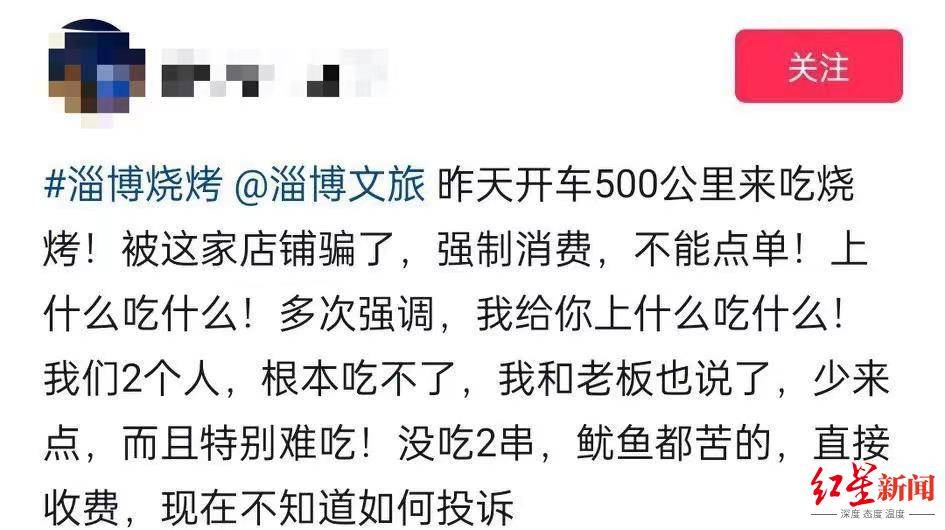 山东淄博烧烤持续出圈。不过,近日据陕西网旗下“白鹿视频”发布消息:有游客网曝,自己在淄博当地一家烧烤店遭遇了强制消费,并提出店铺里食材不够新鲜等问题。视频播出后,#游客称在淄博一烧烤店遇强制消费#的话题在4月17日登上微博热搜,相关话题阅读超过1.7亿。对此,淄博市市场监督管理局工作人员回复称,核实如有这种情况,会以最快速度处理。