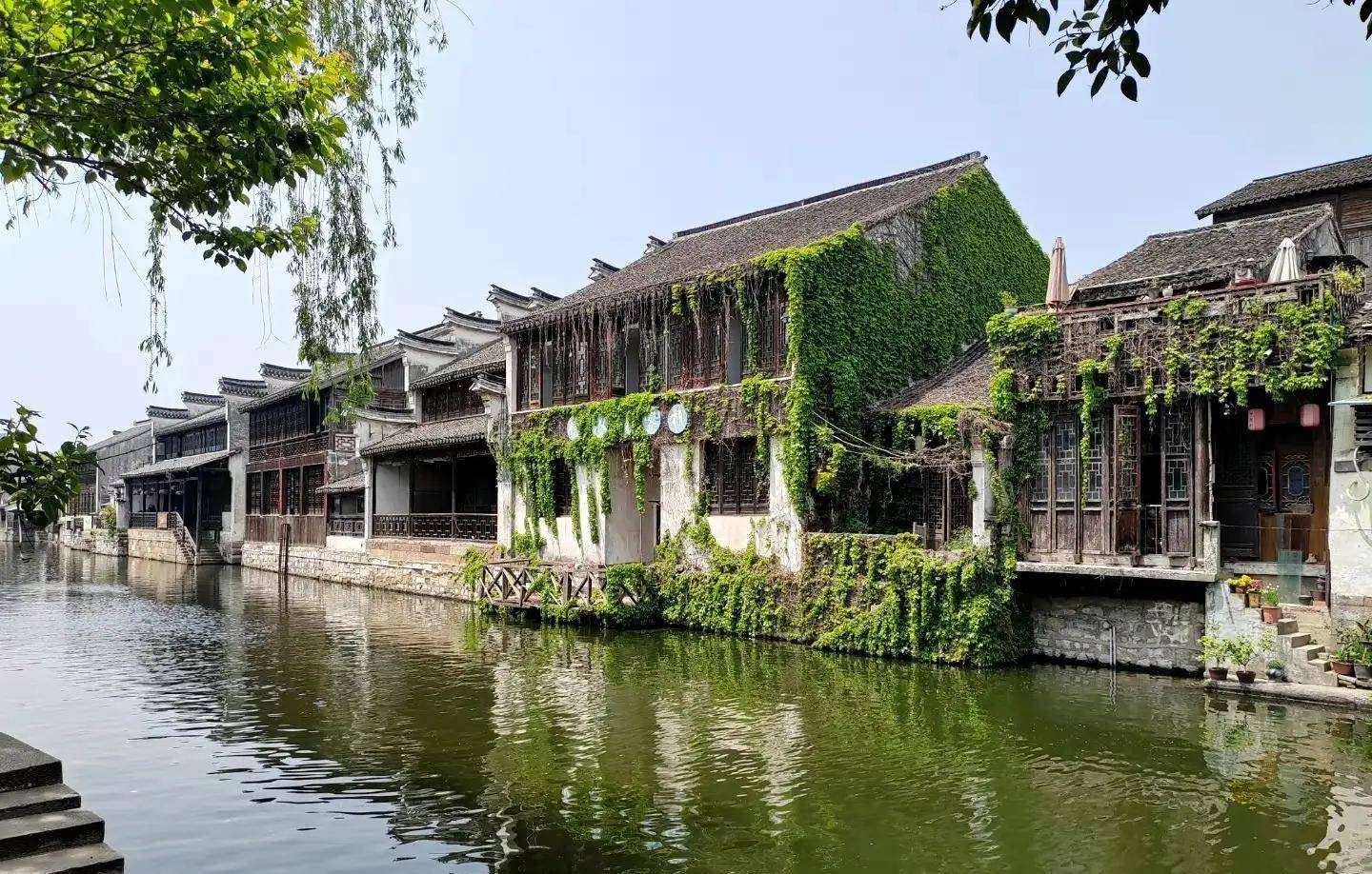 水绕着这些古朴典雅的建筑物,绿色的植物就像是镶嵌在这片美好的风景之中,看起来一切都是那么自然祥和。