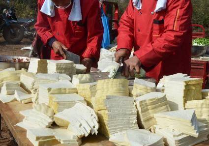 我们都知道河南烩菜的主要材料就是白菜、豆腐、粉条和肉等,这是大师傅在切豆腐,豆腐是村子里的村民自己泡的黄豆,自己磨出来的,很香!