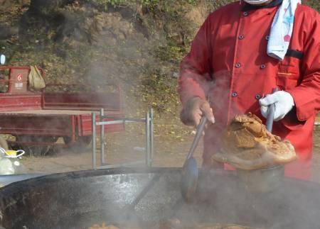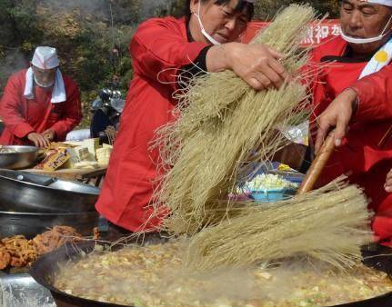 河南的大烩菜是先炒白菜,然后再放入肉炒,再放其他的菜品,最后放干粉条,等粉条成熟的时候,烩菜也就做好了,这是师傅们在往煮烩菜的锅里面放粉条!