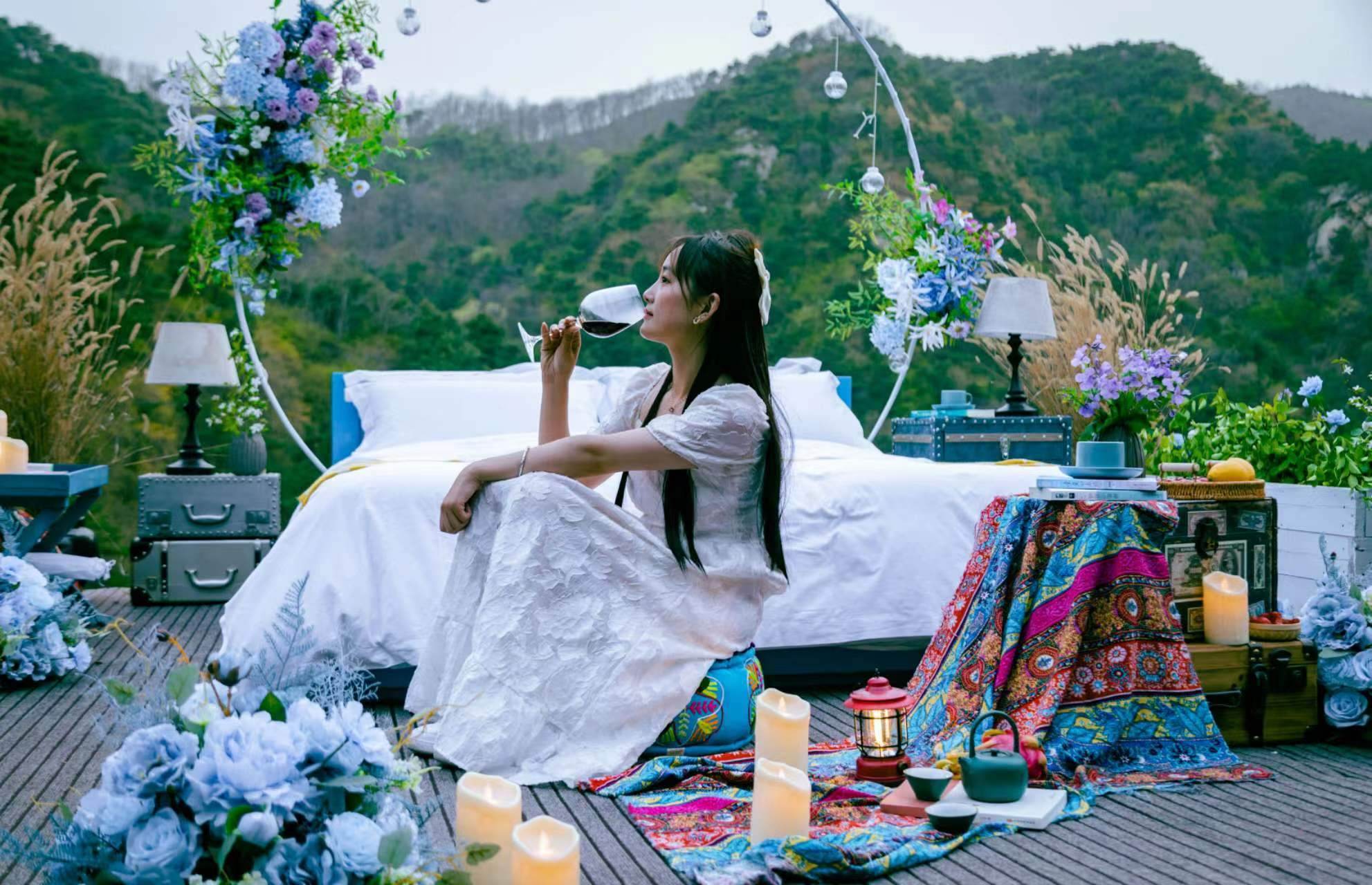 夜晚观星空,打翻一地星河。草坪、山林和三角纱幔木屋帐篷,在这片超大的露营场地,从灯光设计到室内布置,每一处都充满着浪漫的气息。在这里不用费力搭帐篷,拎包入住就可以了,设施超齐全,空调、超舒适大床、精美洗护、科勒卫具、带独立更衣室的独立淋浴间,甚至连拍照小道具都给你安排好了。