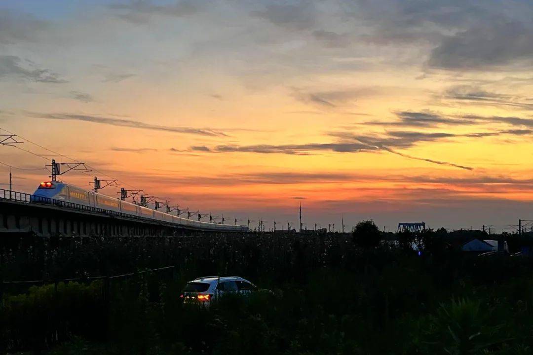 银杏旁紧挨着沪苏通铁路,每当列车驶过,又是一幅绝美的景象。