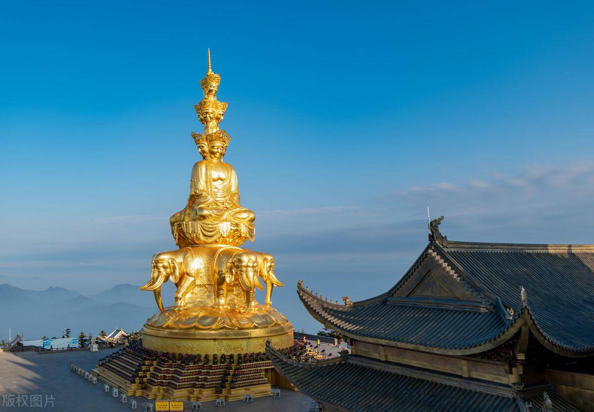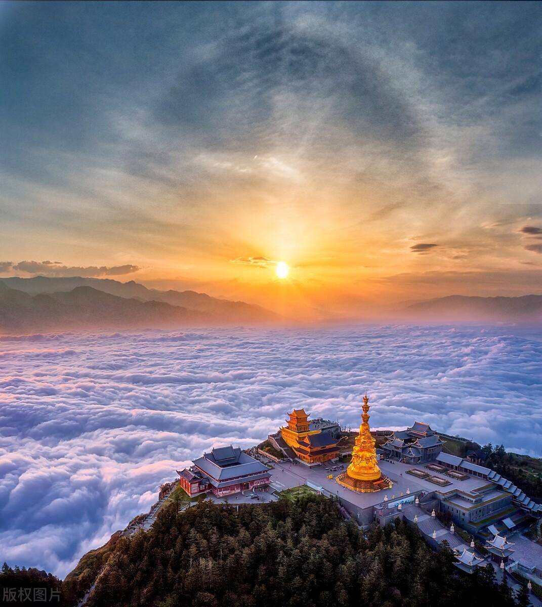 峨眉山的金顶是峨眉山最高的地方,海拔3079米。金顶上有一座巍峨的铜制佛像,高48米,重660吨,是世界上最高的金身佛像。金顶上还有一种奇特的自然现象,就是日出时的“佛光”。当太阳从云海中升起时,会在金顶上形成一道彩虹般的光环,环绕着佛像,仿佛佛陀在显现法身。这种现象非常罕见,只有在特定的气候条件下才能出现,被认为是峨眉山的一大奇观。佛光的出现被认为是吉祥的象征,也被视为佛教信仰的体现。峨眉山是中国佛光出现最频繁的地方之一,每年平均有30多次。