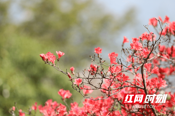 四月的翠鹫峰峦,成片高山杜鹃花正值花期,竞相绽放,吸引众多游客登高赏花。一丛丛、一簇簇的高山杜鹃花娇艳欲滴,争奇斗艳,火红的花儿将崇山峻岭装扮得分外妖娆、格外漂亮。盛开的杜鹃花有深红、玫瑰红等多种色彩;朵朵花儿在蓝天下绽放笑靥,好似红色玛瑙,迎风玉立,娇艳欲滴。花瓣儿密密匝匝,蕊靠着蕊,瓣贴着瓣,相互依偎,竞相辉映。火红的花海与翠绿的大山相映成趣,勾勒出一幅天然画卷,美不胜收,让人流连忘返。