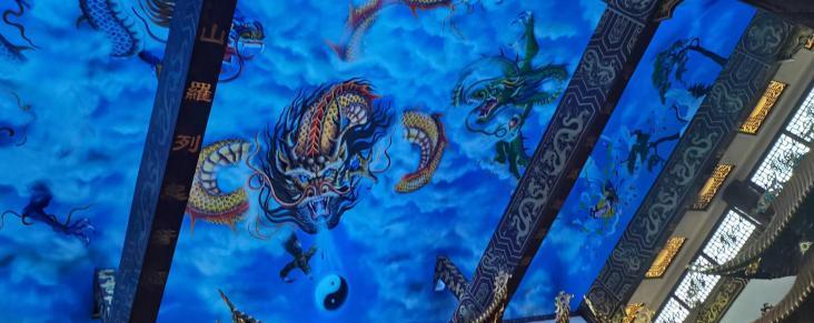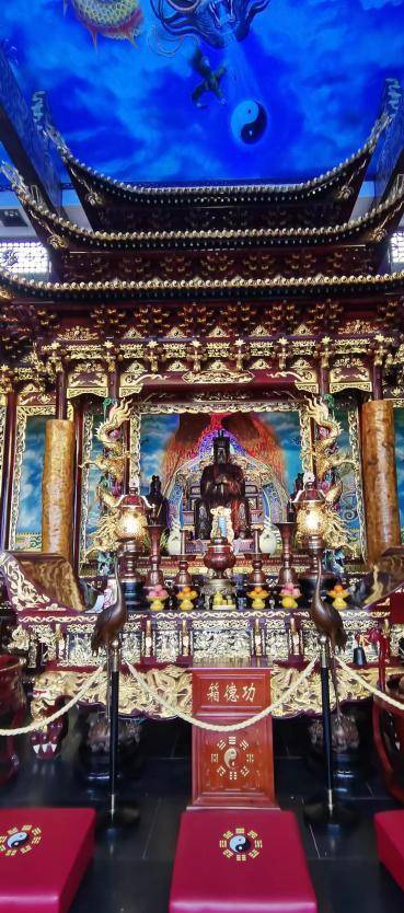 在道观的穹顶,竟然也有一番惊喜的发现!抬头看,整个穹顶散发着深邃的蓝光,几条祥龙在云间追逐着,口中吐出道家的阴阳八卦图了,一时之间,竟然让我分不清这是真的神龙飞翔,还是一幅栩栩如生的画!