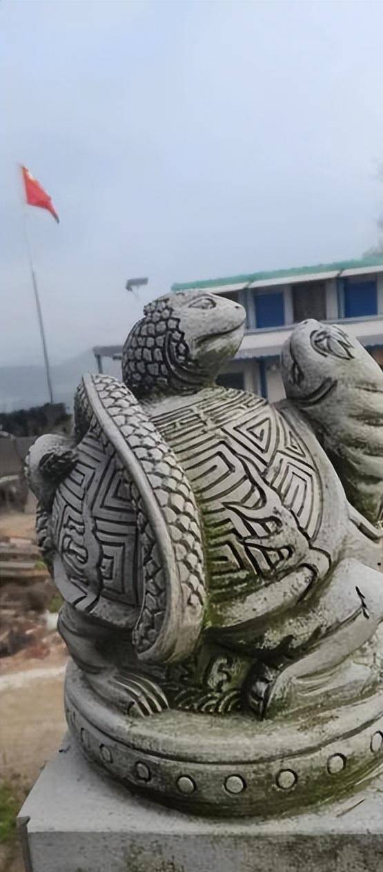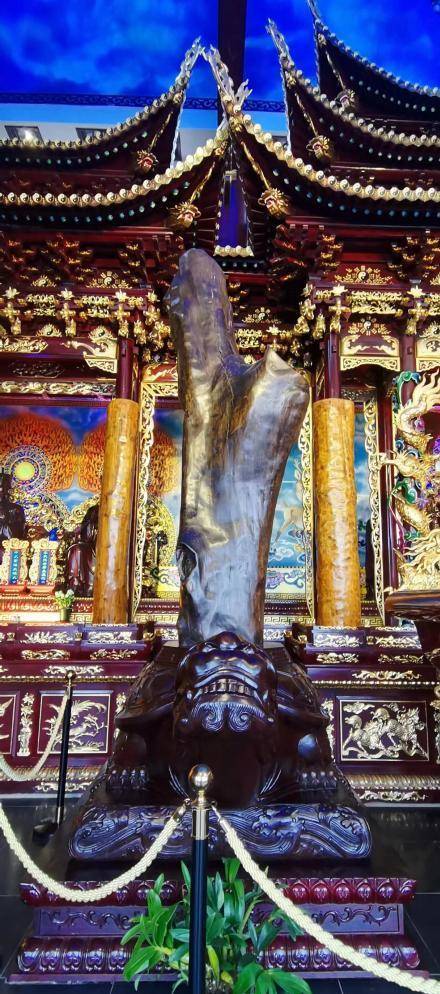 神龛前竖立着两根黝黑发亮的木头,十分粗壮,能放在大殿中央,我猜想这一定是极其珍贵的宝贝!木头下是一只巨大的神龟承托着,所有的一切都与我的想象大相径庭!