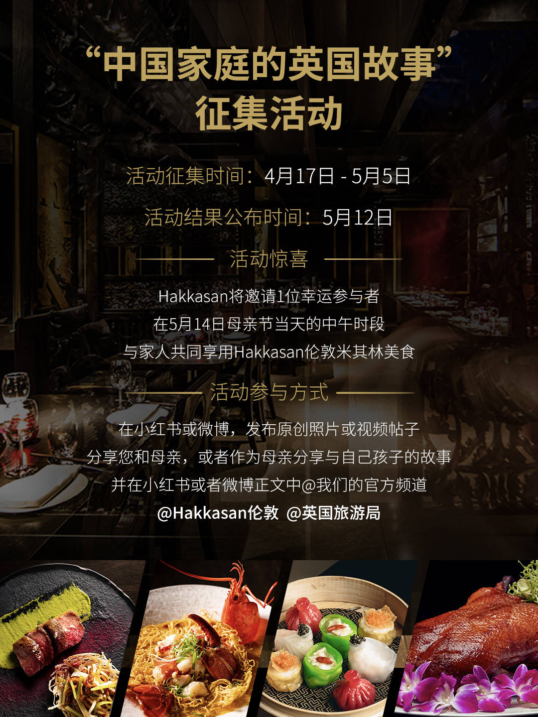 值此美好时刻,英国旅游局与伦敦米其林中餐Hakkasan诚意发起,“中国家庭的英国故事”征集活动,邀请大家分享自己家庭与英国伦敦的故事,和我们一起庆祝中国母亲节的到来。