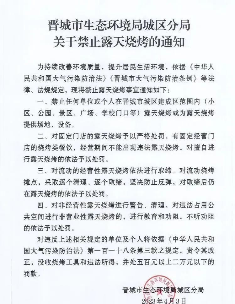 晋城也是烧烤却被骂上热搜,烧烤摊成了城市污染的罪魁祸首,4月3日,晋城发布通知,通知要求,流动的经营性露天烧烤、非经营性露天烧烤将依法进行取缔、清理,对于违反规定的最高处罚高达2万元。
