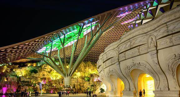 这栋楼总投资40亿,总建筑面积13.6万平方米。从外观上分为大穹顶、小穹顶和佛顶崖三部分。同时,内部也分为三大空间,具有很好的佛教文化融合风格,这样的建筑风格非常宏伟,在宗教建筑中非常特别。