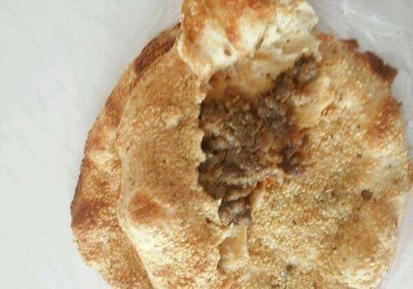 淄川肉烧饼又薄又圆,两面金黄,其中一面撒满芝麻粒,饼内带有肉馅丁,吃起来筋道耐嚼,满口醇香。
