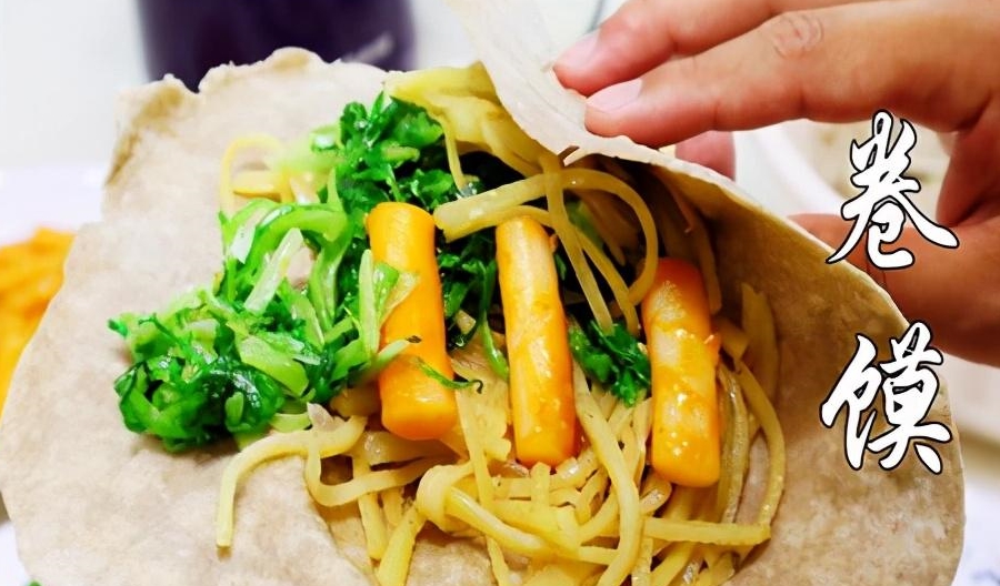 6、根据个人口味依次放适量的菜在面饼上,并均匀卷好,就这样一道美味的卷馍就做好了!一口咬下去,松软又不失嚼劲的面皮,混入麻辣脆爽的土豆丝,香辣Q弹的年糕,新鲜翠绿的苦菊菜,此刻脑海里涌出一个字:绝!哈哈哈哈,是真好吃哦,大卷一下吃了3个。