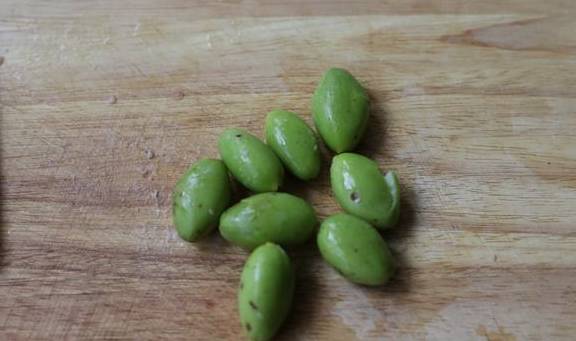 2.青橄榄几颗,洗干净,用刀背轻轻拍一下,拍扁的青橄榄更容易出味道,因为橄榄核很硬,一般不容易煲煮出味道,拍扁后就很容易出汁儿了。