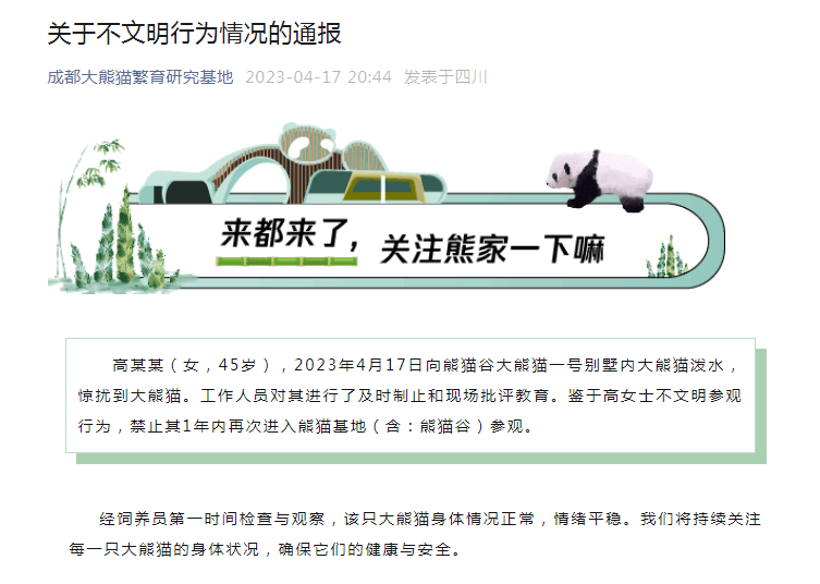 4月17日晚,成都大熊猫繁育研究基地发布关于不文明行为情况的通报: