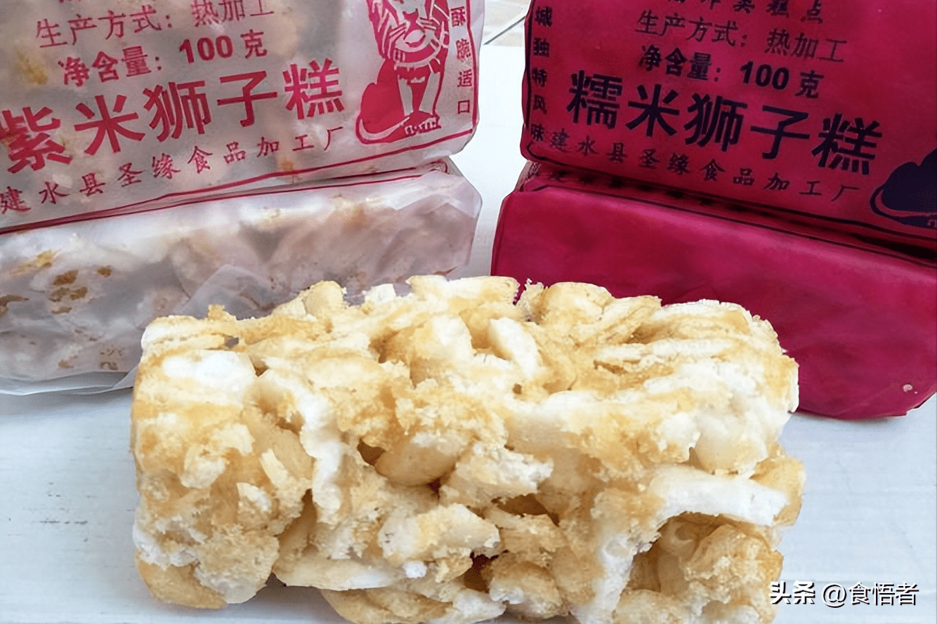 建水狮子糕的主要原料为上等糯米、米制馅糖和少量蔗糖。制作时,先将糯米用清水浸泡 10~15天,然后将糯米蒸熟合团压片,切条,晾干,再放入莱油锅里炸至泡酥,冷却后,用80%的米糖和20%的蔗糖包裹,压扁,切块,即为成品。成品酥脆甜香,美味可口,很受消费者的欢迎。