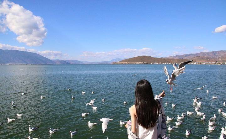 洱海的水非常清澈,而且平均深度达到了10.5米,每年秋冬季节,都有来自西伯利亚的海鸥到洱海旁边过冬,让这里简直跟真正的大海一模一样。洱海的海鸥并不怕人,你甚至可以直接用手拿着食物喂食它们,别有一番风味。