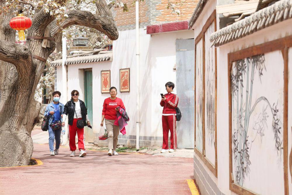 4月10日,游客在兰州市皋兰县什川古梨园游玩。新华社记者 马希平 摄