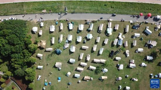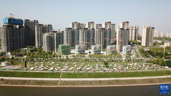 4月16日,市民在长沙市开福区湘江畔露营休闲(无人机照片)。