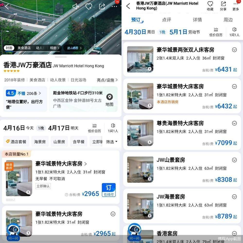 在内地游客赴港需求持续增长的同时,香港的酒店价格也应声上涨。据携程App,4月30日(“五一”假期第二天)香港JW万豪酒店豪华城景特大床客房的价格为6432元/晚(含税/费),而同为周日的4月16日同房型房价为2956元/晚(含税/费),涨幅达118%。4月30日香港半岛酒店豪华大床房的房价为6520元/晚(含税/费),4月16日同房型房价为4186元/晚(含税/费),涨幅达56%。