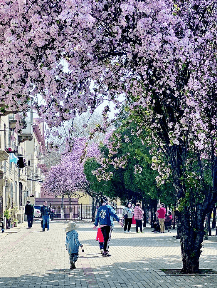 一个舒适宜人的城市,往往有富有魅力的小型公共空间散布在社区街巷,西岗区北石道街附近的一处绿化带便是这样的存在。无论是车中的乘客,还是经过的路人,都会禁不住想拍一张照片发个朋友圈。沿着北石道街南行,两侧的人行道已成为"花间小路",桃花和榆叶梅相继开放。4 月的这里简直是给路人的专属美景。
